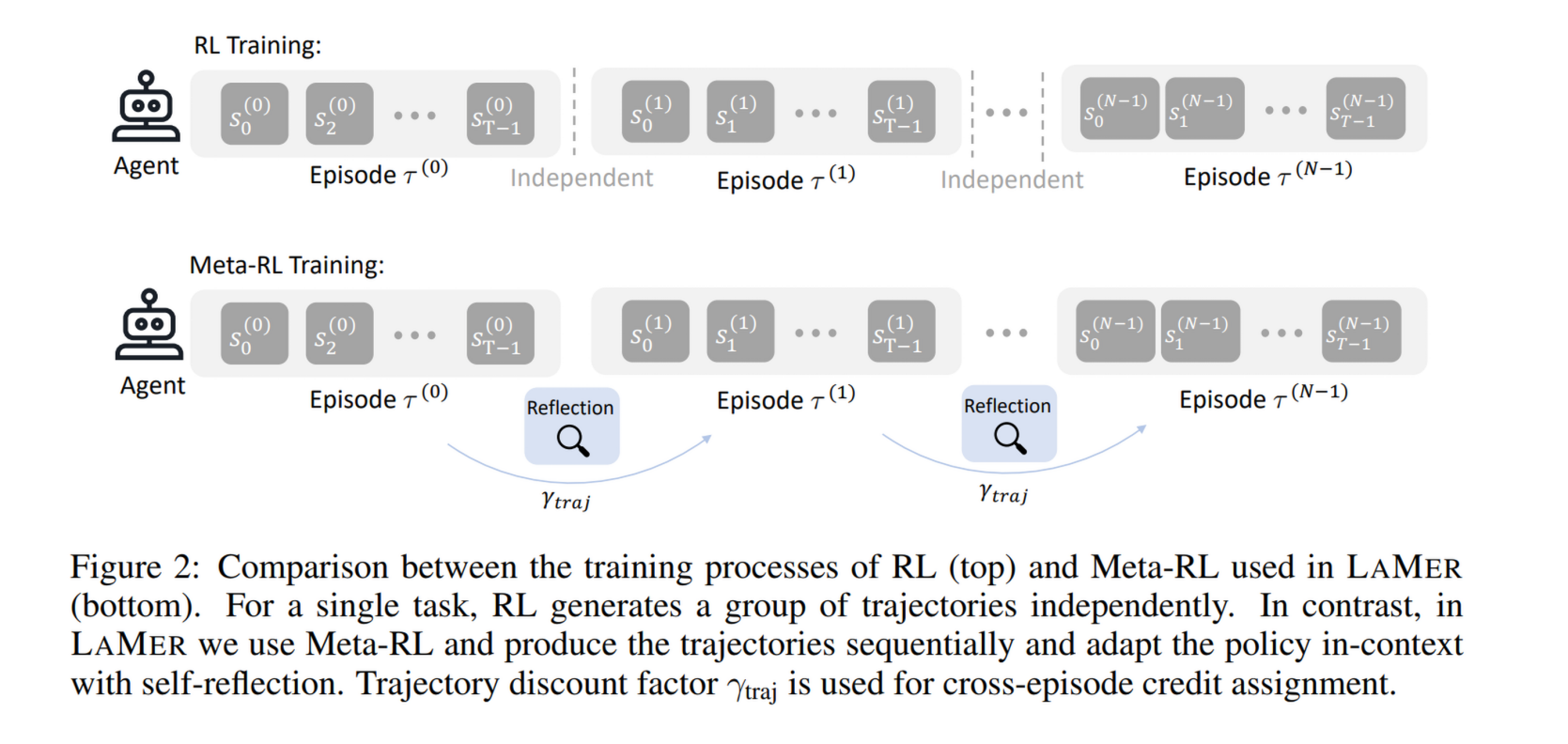 - 传统的 RL 智能体训练通常针对单个回目(Episode)优化。而 LAMER 将“一个试验(Trial)”定义为包含 个回目的序列。