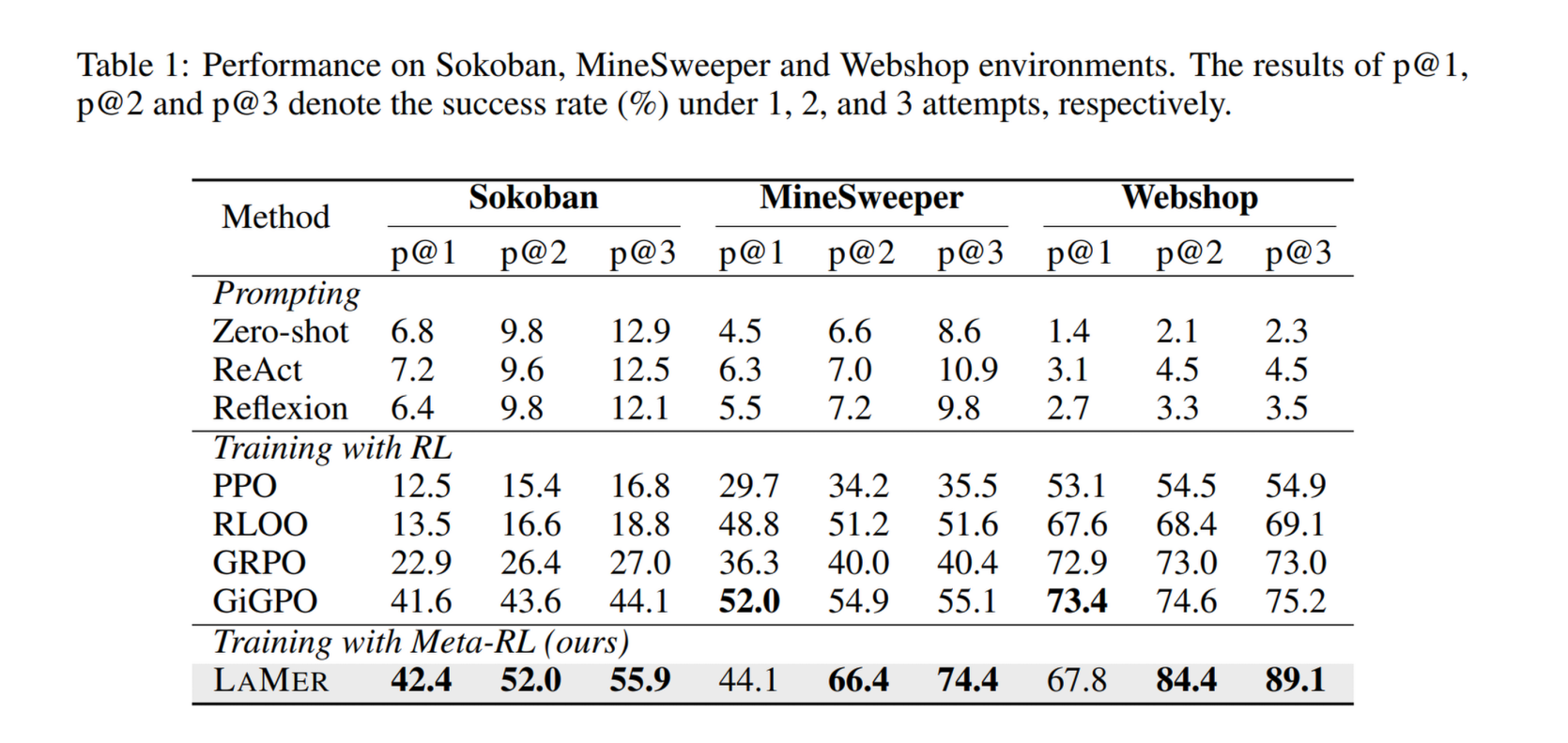 LAMER 的成功证明了: LLM 智能体并不缺乏学习能力,而是缺乏鼓励探索的训练机制。通过 Meta-RL 框架,模型不仅学会了如何执行动作,更学会了如何从失败中提取信息并进行自我修正。