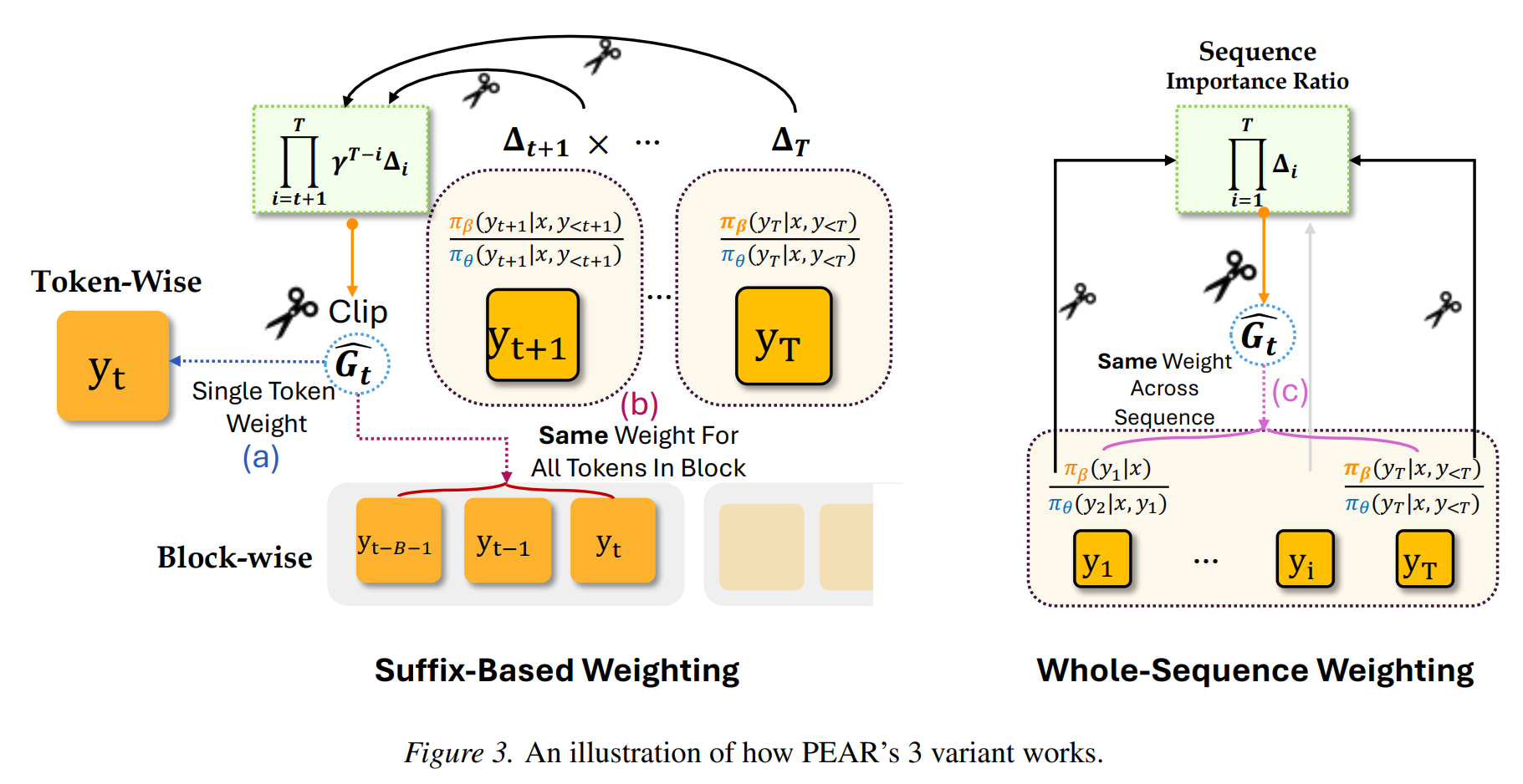 PEAR 保持基础的 per-token 损失 不变,只是在外面乘上一个停止梯度更新(stop-gradient)的权重 。文章提出了三种计算权重的变体: