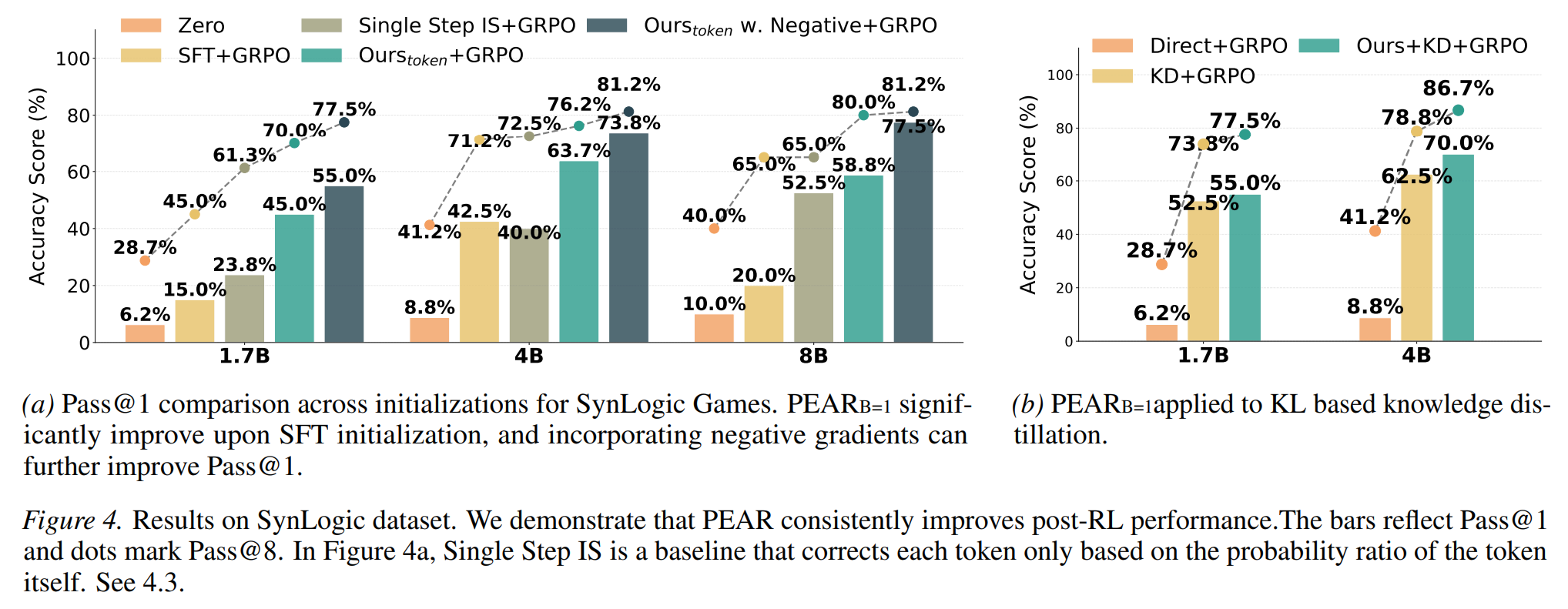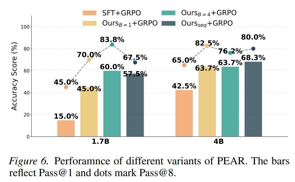 - 意义:这意味着 PEAR 在离线阶段就已经在做“类似在线 RL 想做的事情”,使得线下线上的更新方向保持一致,减少了 RL 阶段纠正 SFT 错误所带来的内耗
