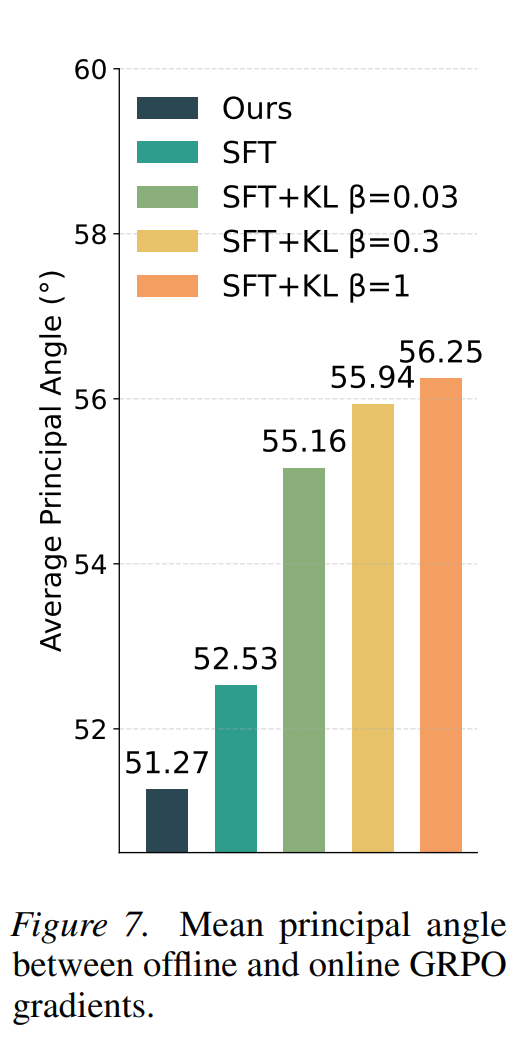 这是文章非常精彩的一个分析。作者测量了离线阶段的梯度与在线 GRPO 阶段的梯度之间的平均主视角(Principal Angle)