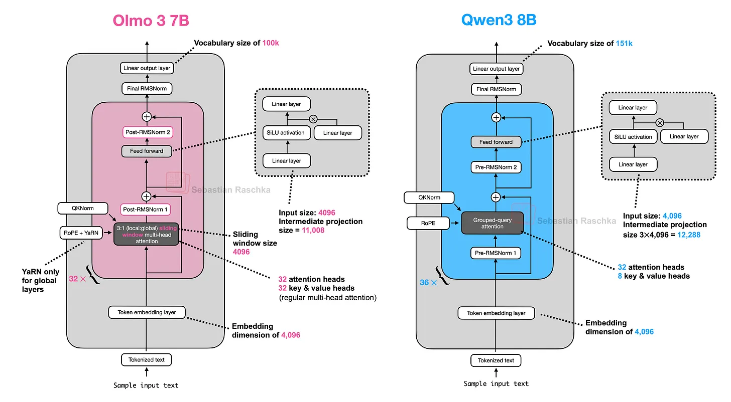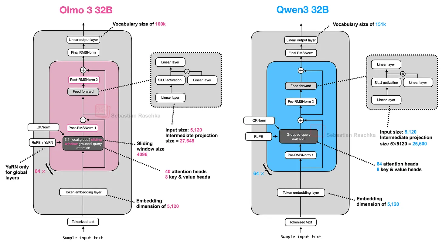 As we can see, the Olmo 3 architecture is relatively similar to Qwen3. However, it’s worth noting that this is essentially likely inspired by the Olmo 2 predecessor, not Qwen3.