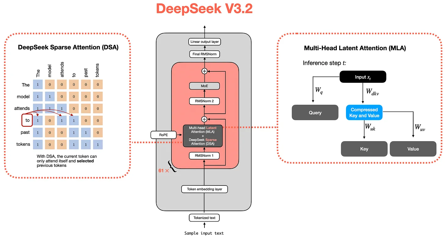 Recently, open-weight LLM developers shared flavors of their core architectures optimized for efficiency. One example is Qwen3-Next (see previous section), which replaces some of the full attention blocks with a fast gated DeltaNet module. Another example is DeepSeek V3.2, which uses sparse attention, a linear attention variant that trades off some modeling performance for improved computational performance (I plan to cover this mechanism in more detail in an upcoming article).