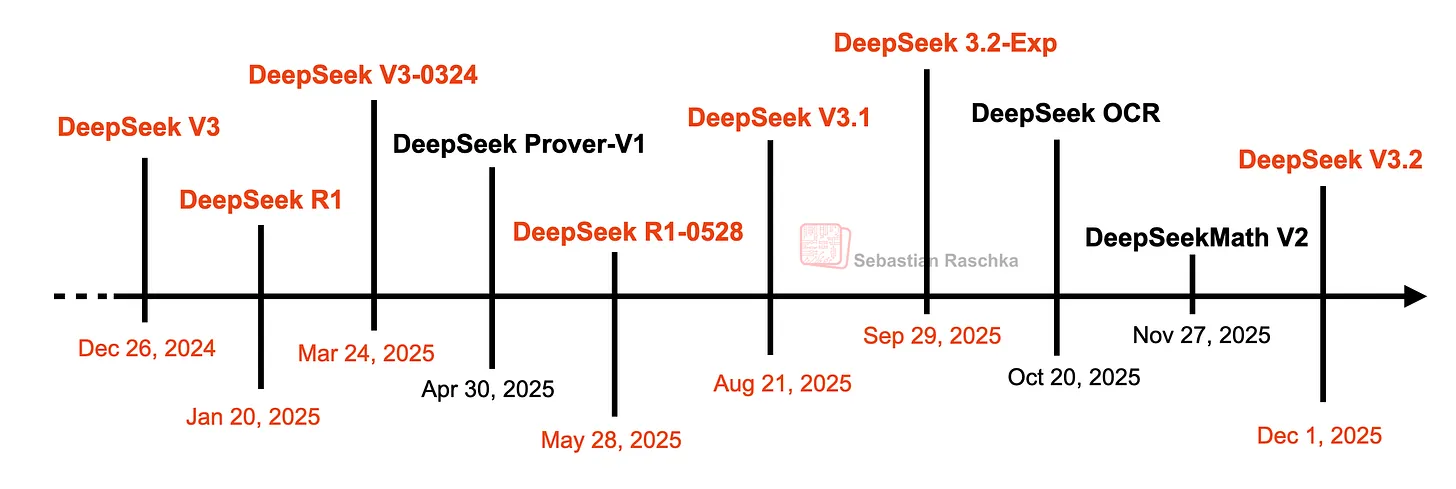 Figure 47: A timeline of the DeepSeek model releases since DeepSeek V3. The main models are shown in red.