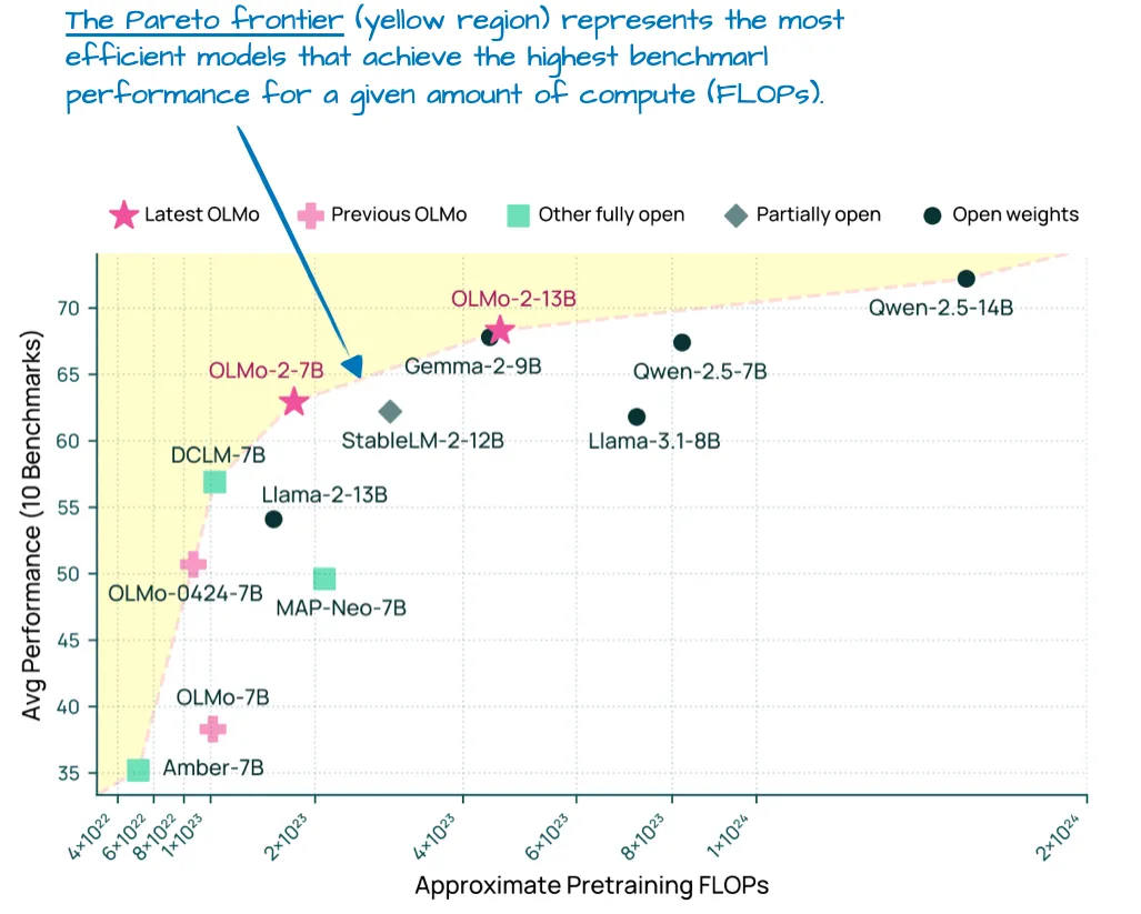 Figure 7: Modeling benchmark performance (higher is better) vs pre-training cost (FLOPs; lower is better) for different LLMs. This is an annotated figure from the OLMo 2 paper, https://arxiv.org/abs/2501.00656
