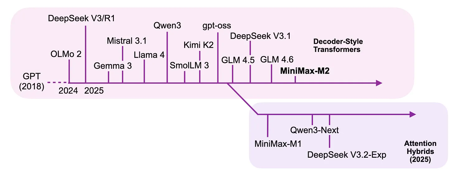 Interestingly, there was a recent plot twist, where the MiniMax team released their new 230B parameter M2 model (discussed in section 13) without linear attention, going back to regular attention. The team stated that linear attention is tricky in production LLMs. It seemed to work fine with regular prompts, but it had poor accuracy in reasoning and multi-turn tasks, which are not only important for regular chat sessions but also agentic applications.