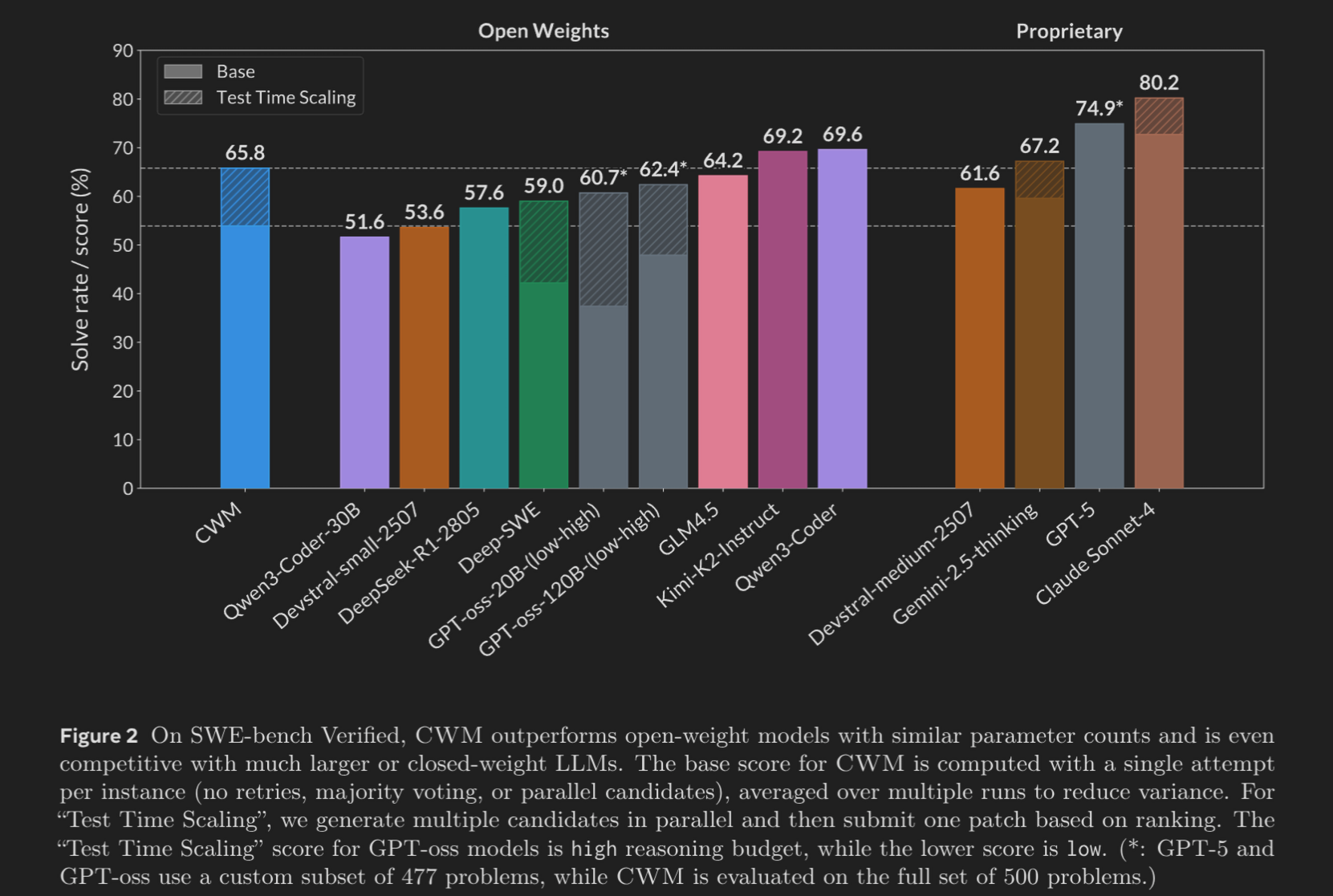 CWM (32B) 展现了超越其参数规模的性能,甚至能够挑战更大或闭源的模型: